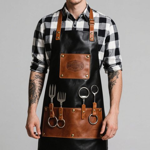 Avental de Couro Preto e Marrom Durável com Alças Ajustáveis e Bolsos para Ferramentas, Ideal para Chefs de Churrasco, Baristas, Lavagem de Carros e Cozinheiros Domésticos